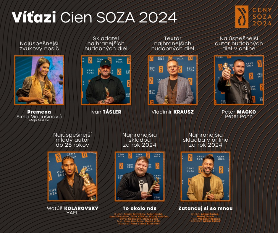 V bratislavskom Divadle P. O. Hviezdoslava sa včera večer uskutočnil 29. ročník slávnostného odovzdávania Cien SOZA (Slovenského ochranného zväzu autorského) najhranejším autorom za rok 2024. Ceny SOZA sú jediným významným hudobným ocenením na Slovensku. Každoročne sú udelené autorom, ktorých diela dosiahli najvyšší počet prehratí a najväčší úspech v uplynulom roku, ako aj tým, ktorí sa významne podieľali na rozvoji slovenskej hudobnej kultúry.