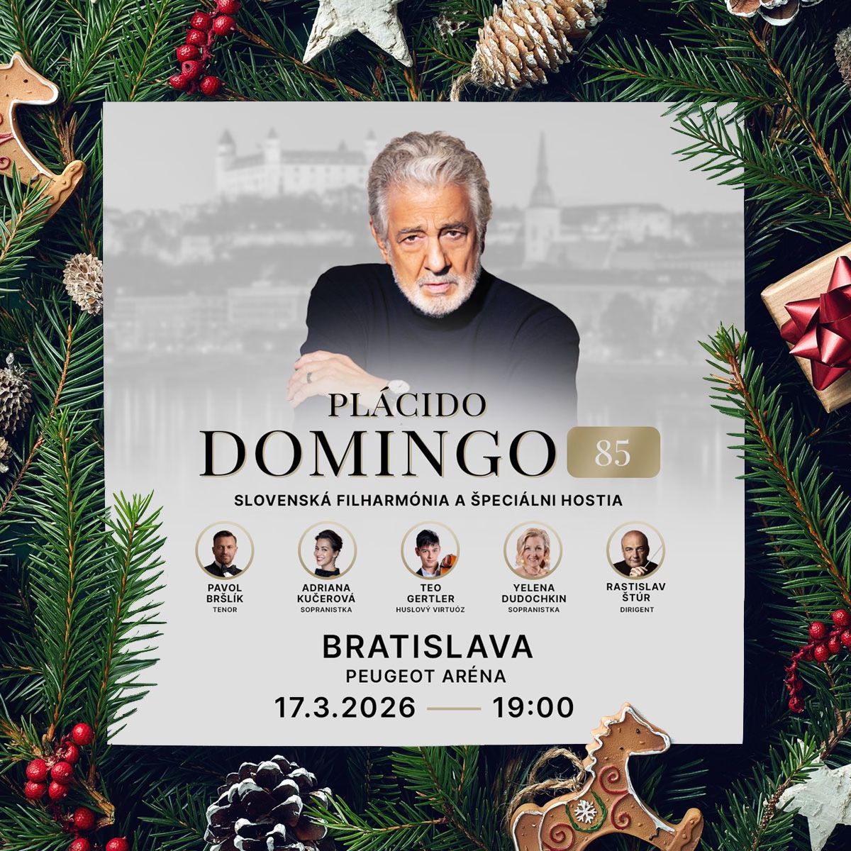 Predstavovať Placida Dominga by bolo lievaním vody do Dunaja. Do Dunaja preto, že bude to práve Bratislava, ktorá privíta jedného z najväčších umelcov hudobného sveta. Plácido Domingo sa v hlavnom meste Slovenska predstaví pri príležitosti svojich 85. narodenín, ktoré oslávi exkluzívnym galakoncertom galav Peugeot Aréne. Výnimočný večer, ktorý sa uskutoční iba raz – 17. marca 2026 – spojí charizmu legendárneho speváka s umením Slovenskej filharmónie. Je veľkou poctou pre Slovensko, že práve náš národný orchester bude mať česť sprevádzať jedného z najväčších operných umelcov všetkých čias.